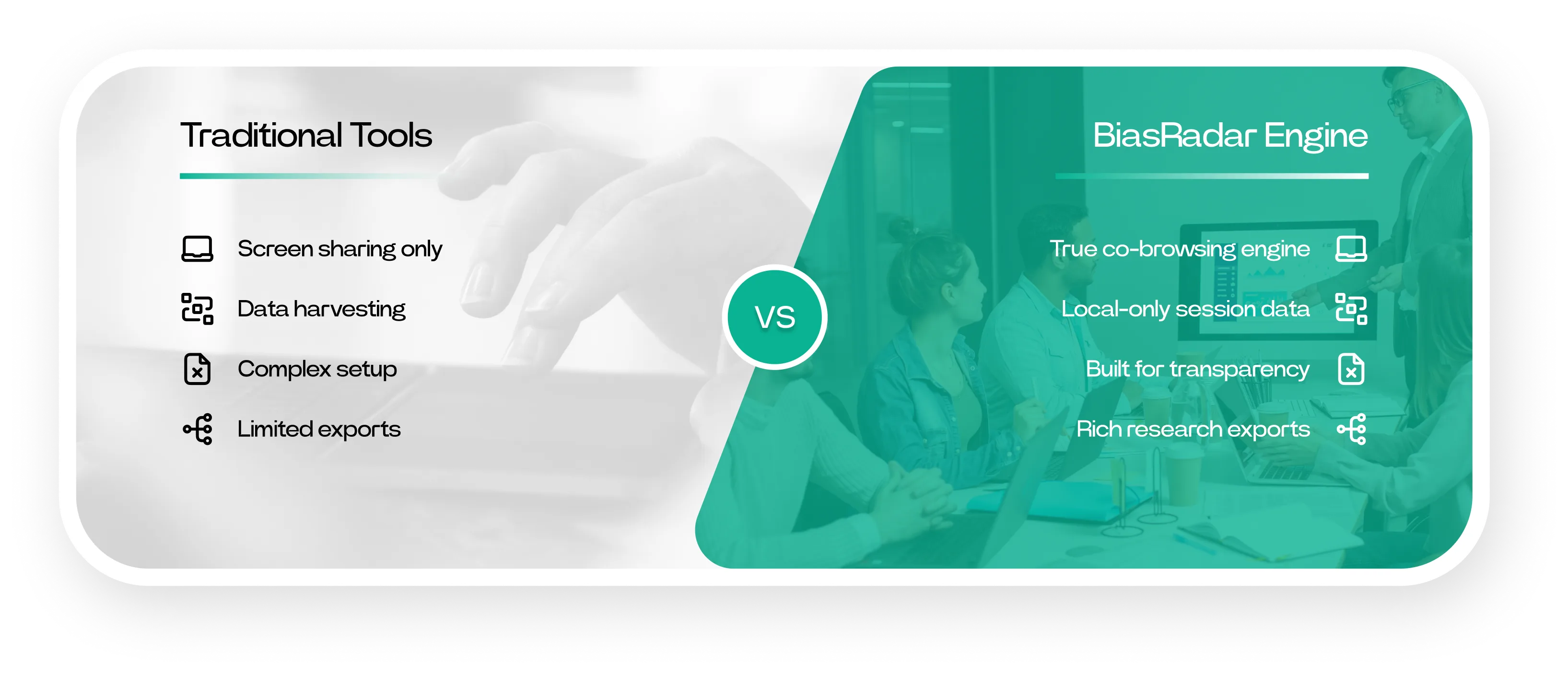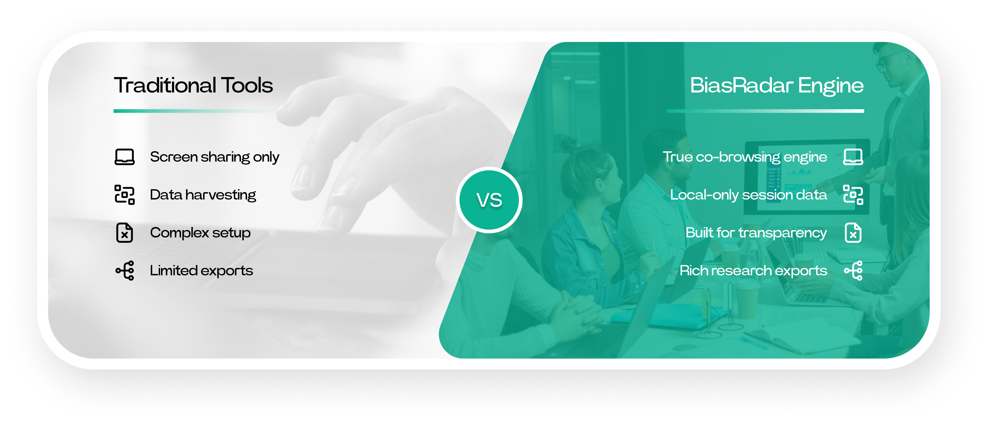 BiasRadar empowers groups with seamless, secure, interactive co-browsing for research, comparison, and shared decisions. We reveal the hidden algorithmic behaviors that shape your digital reality.